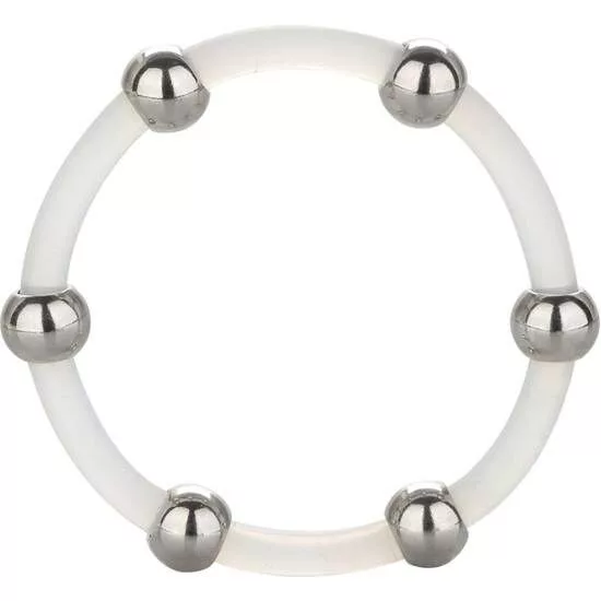 A szenvedélyes örömgyűrű szilikon és rozsdamentes acél gyöngyökből készült.