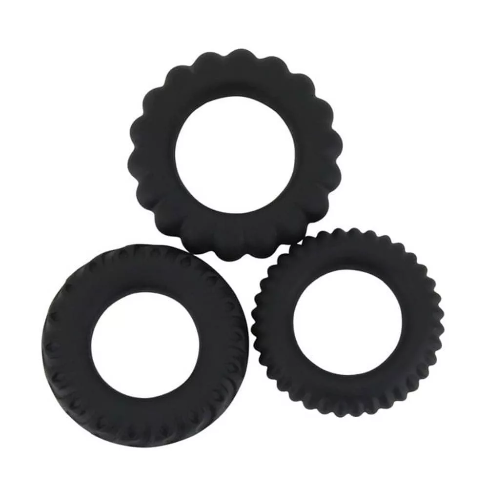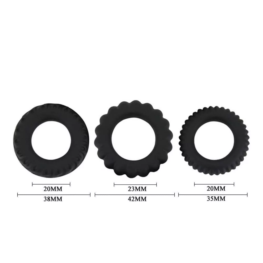 Bőrbarát anyagból készített, férfiaknak ajánlott, péniszre helyezhető, 3 darabból álló erotikus készlet, mely elősegíti merevedés fenntartását viselője számára. Kialakítása révén behatolás közben a hüvely izom idegvégződéseinek stimulálására is tökéletesen alkalmas.
