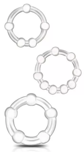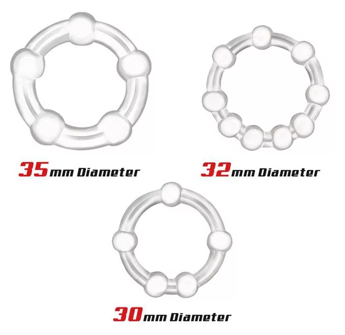 Fedezd fel a vágy új dimenzióját! Ez a három különböző átmérőjű, átlátszó mini péniszgyűrű szuper puha TPR anyagból készült, erősítve az izgalmat és a kellemes érzéseket minden egyes pillanatban. Élvezd a fokozott ingerlést és az önfeledt játékot a 30mm, 32mm és 35mm átmérőkkel. Emeld új szintre az intimitást!