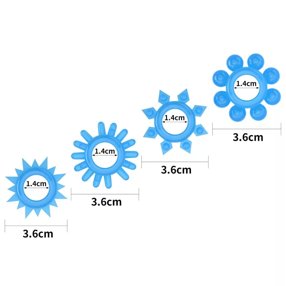 Ein 4-teiliges erotisches Set, das für Männer empfohlen wird und dunkelblau auf den Penis gelegt werden kann, was hilft, eine Erektion für den Träger aufrechtzuerhalten. Aufgrund seines Designs eignet er sich auch hervorragend, um die Nervenenden des Vaginalmuskels während der Penetration zu stimulieren. Die äußeren und inneren Durchmesser der Ringe sind gleich. Es wird empfohlen, sie tagsüber dem Licht auszusetzen, um das beste Ergebnis zu erzielen.