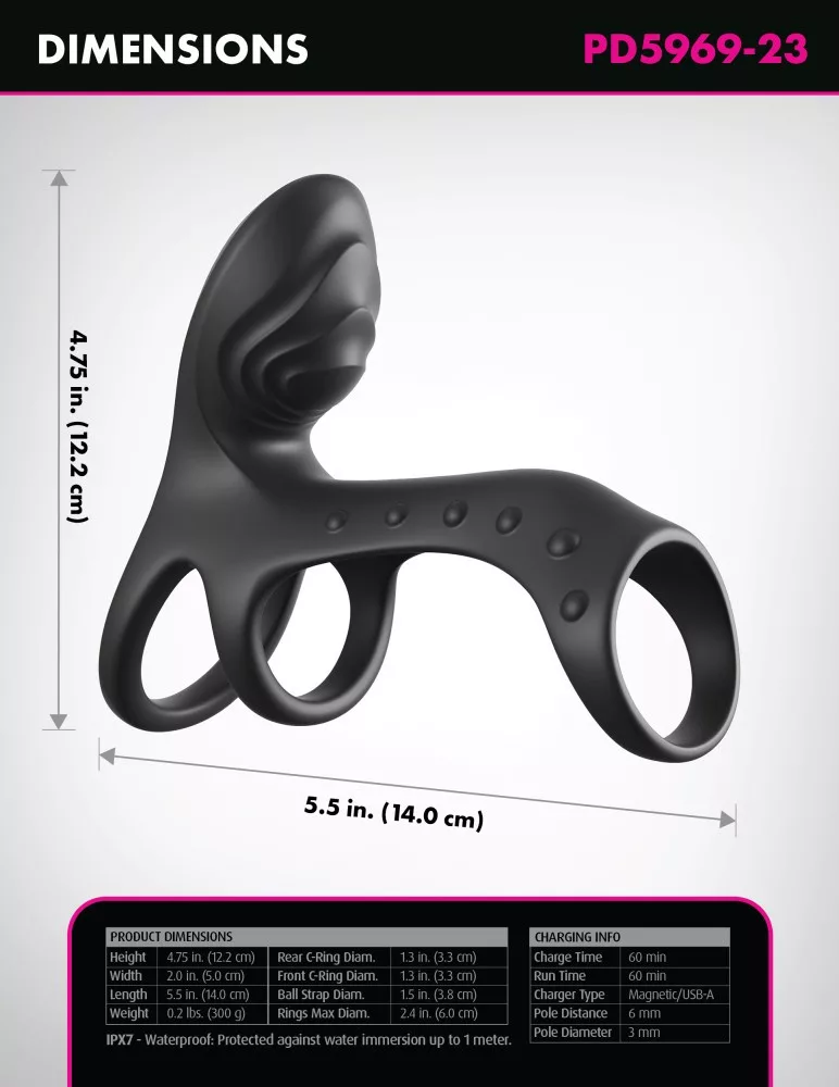 Penis und Hoden, ausgestattet mit 2 Motoren, 3 Penisring mit Geschwindigkeit und 7 Vibrationsstufen. Seine Spezialität ist die Doppelter Klitorisstimulator, der gleichzeitig innere und äußere Stimulation bietet. A Das Produkt ist mit einem diskreten Reiseschloss ausgestattet, das sich beim Aufladen automatisch entriegelt. A Um zu verriegeln/entriegeln, drücke und halte den Power-Knopf 7 Sekunden lang.